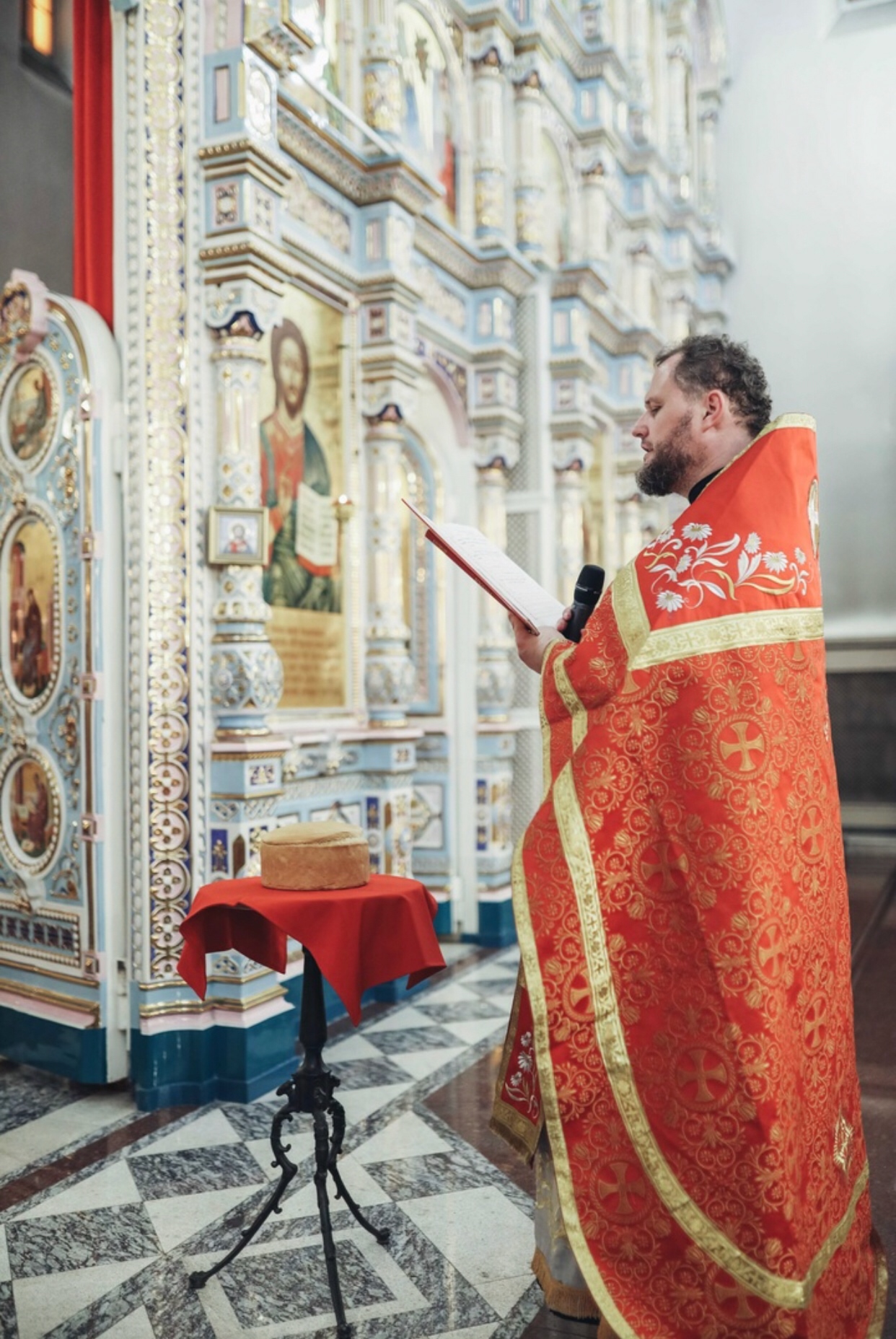 На службе о. Вячеслав освятил особый хлеб с изображением Креста - Артос. Он будет храниться в храме перед открытыми Царскими вратами до следующей субботы, а потом его раздадут верующим.
